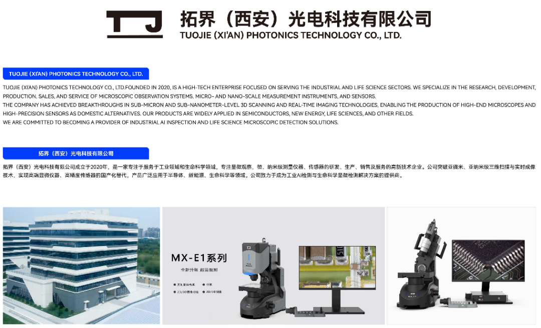 作为扎根西安的科技企业,拓界光电自 2020 年 10 月成立以来,便聚焦工业与生命科学领域的微观研究需求,打造 “工业测量 + 显微观测” 双轨服务体系:一方面为工业制造提供测量与质量保证创新性解决方案,助力企业提升生产精度;另一方面为生命科学、材料研究领域定制显微观测方案,支撑科研突破。短短数年,公司凭借技术硬实力与服务专业性快速打开市场,目前已服务 200 +家国内外客户,其中不乏京东方、英特尔、华为等行业龙头,产品适配性与稳定性获得市场高度认可。
